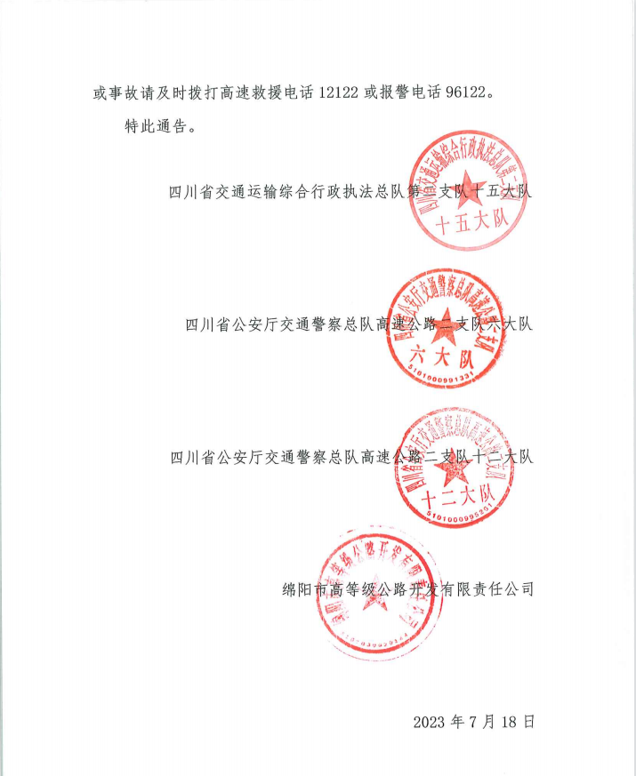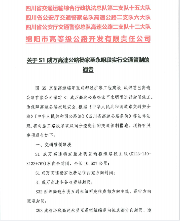 關(guān)于S1成萬(wàn)高速公路楊家至永明段實(shí)行交通管制的通告